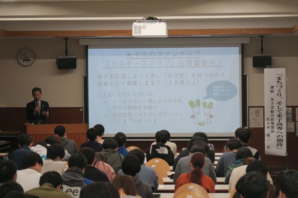 佐々木氏より、米子市が重点的に取り組んでいる「歩いて楽しいまちづくり」を取り上げ、街中を歩いて楽しむ文化を創出する取り組みとして、米子駅の南北を繋ぐがいなロードを整備したことに加え、駅南開発において目久美公園を米子高専から受けた提案を基に設計中であること、米子城跡の案内デザインを米子高専に委託していることなど、市と米子高専が多くの連携を図っていることをお話しいただきました。佐々木氏は、今後これまで以上に米子高専との連携を増やしていきたいと思いを語られました。