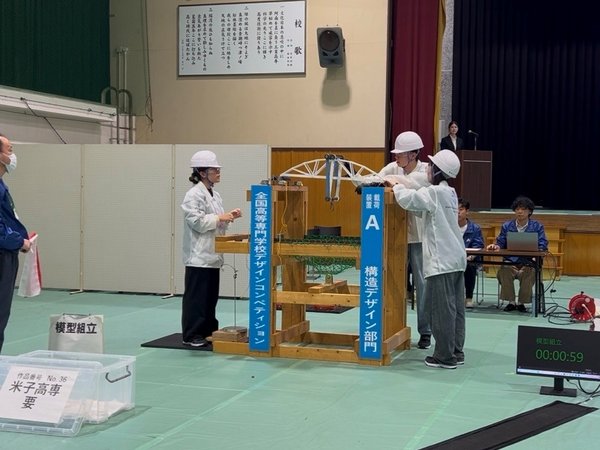 「構造デザイン部門」では、「つなげる架け橋」をテーマに、紙を素材とした2つ以上の部材をつないだ 1つの橋を作製し、その耐荷性、軽量性、デザイン性が競われました。本校参加の2チームとも、課題である40kg載荷+衝撃載荷をクリアし、最優秀賞(国土交通大臣賞)と2位の優秀賞(日本建設業連合会会長賞)を受賞し、7年連続の最優秀賞受賞となりました。