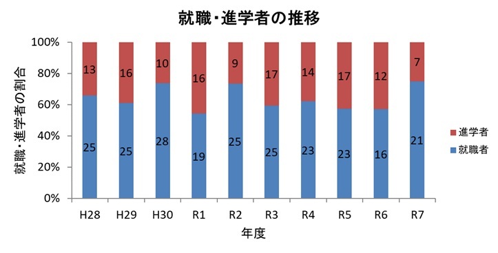 機械システムコース(旧 機械工学科)の卒業生が活躍する場所は機械系ばかりではありません。食品や化学といった機械とはあまり関係ないように見える業種でも、生産システムの設計や維持管理などに機械の知識をもった技術者は必ず必要とされます。このため、機械システムコースの卒業生に対する求人は非常に多く、その分野もいろいろな方面にわたっています。 昨年度の卒業生に対する求人は739社、就職希望者に対する求人倍率は35倍となっています。昨年度卒業生の進路内定率は100%に達しています。